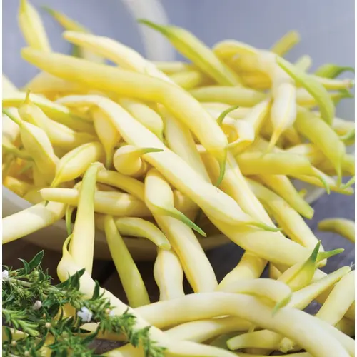 The creamy yellow pods are 14cm (5 1/2") long, flat, straight and stringless. The 38-45cm (15-18") high plants offer a heavy yield of tender, tasty beans.