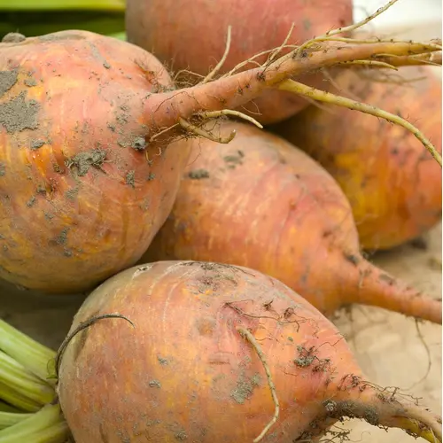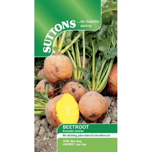 A superb, yellow-fleshed beetroot, providing great colour in salads or pickles. Leaves can be cooked like spinach. Row 4.5m (15'). Globe variety. Maturing 12-16 weeks from sowing. No staining, juice doesn't run when cut. A good source of fibre, potassium and calcium.