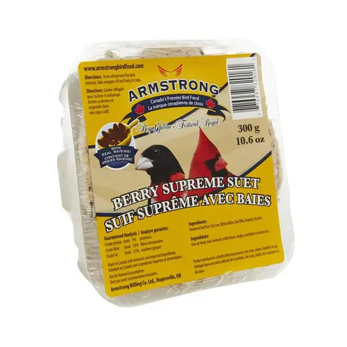 Beef tallow based snack for wild birds – full of high energy nutrients! Liquid beef fat is blended with a mix of grains & seeds and made into a slim cake. Armstrong Berry Supreme Suet is made with fruit & nuts for fruit & nut loving birds. Best fed during colder winter months.