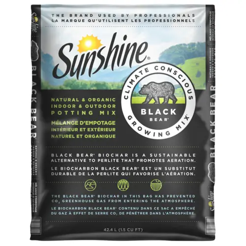 Sunshine® Black Bear® Indoor & Outdoor Potting Mix is formulated with Black Bear® biochar, a sustainable alternative to perlite that optimizes aeration. The Black Bear® biochar in this bag has prevented CO2 greenhouse gas from entering the atmosphere.
