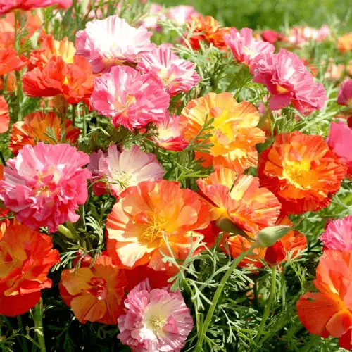 Fully double blooms in a vibrant colour range glisten above a mass of feathery blue-green foliage. These dainty hardy annuals are tougher than they appear and positively thrive on poor, dry soils. The papery flowers attract bees and hoverflies, and make excellent, if short-lived, cut flowers. California poppies are easy to grow in beds and borders, or let them self-seed throughout gravel gardens to form natural drifts. Flowers July-August. Height 20-30cm (8-12"); spread 20-30cm (8-12").