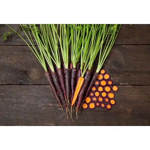 Strikingly beautiful, purple carrots with dark purple skin and cheerful, orange cores.