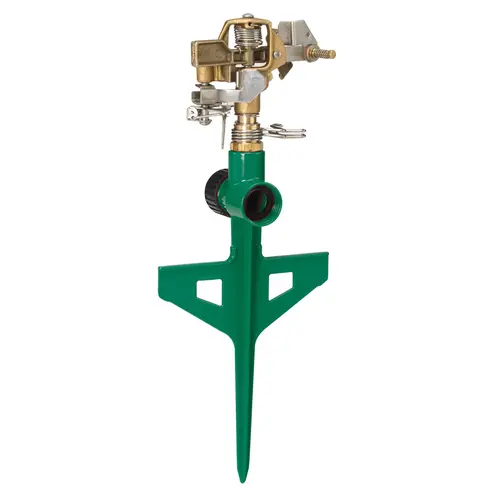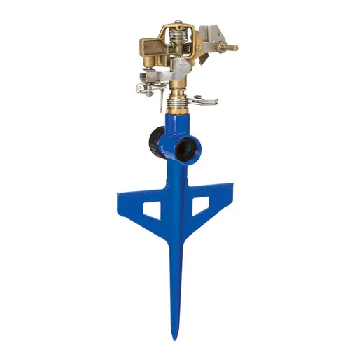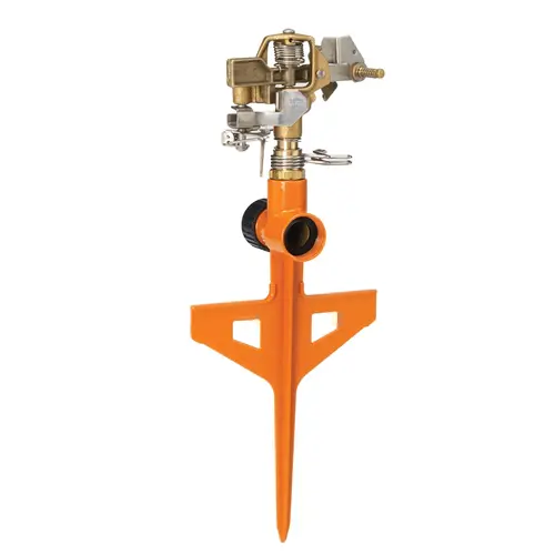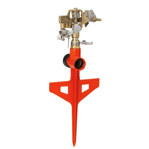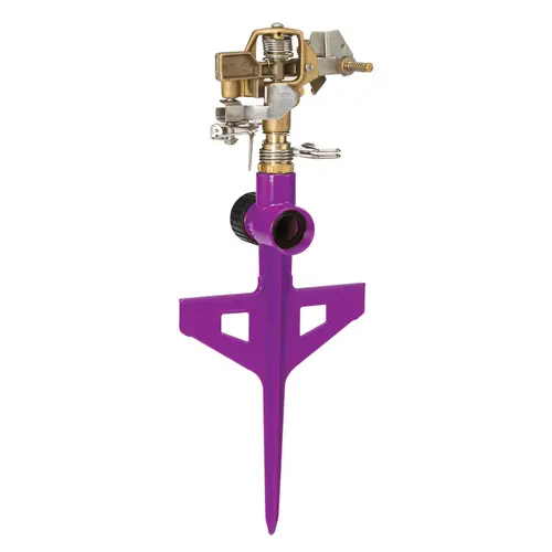 The ColorStorm Impulse Stake Sprinkler is an all brass impulse sprinkler head on a 6" heavy-duty metal stake. This handy impulse sprinkler, with the step-in 6" stake has adjustable partial and full circle patterns, with water coverage up to 70' in diameter. The eye-catching color and design of the ColorStorm Stake Impulse Sprinkler makes a stylish and functional tool in your yard; Lifetime guarantee and available in 6 brilliant colors: red, orange, yellow, green, blue and berry.