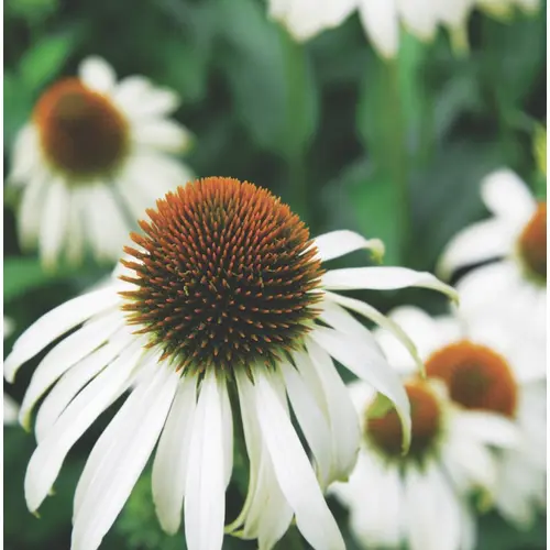 Outstanding garden performers that bear masses of large daisy-like flowers with dome-shaped centers from mid-summer until well into autumn. Drought tolerant plants combine well with most other perennials. Make excellent and long lasting cut flowers. White Swan is a beautiful, pure white with tall dark-green leaves that produce 7-10cm (3-4") white petals surrounded by a greenish-brown centre cone.