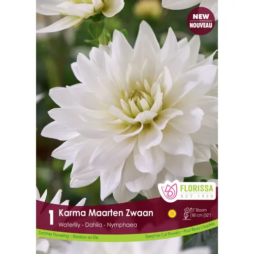 White waterlily dahlia. Great as a cut flower! Plant in a full sun location with well draining soil when ground temperatures warm, usually early June in Nova Scotia once risk of frost has passed. Lift tubers and store in vermiculite late fall after the first hard frost. 1/pkg.