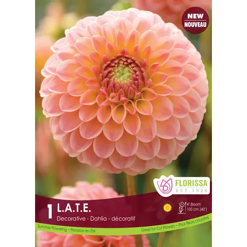 Soft peachy orange decorative dahlia. Great as a cut flower! Plant in a full sun location with well draining soil when ground temperatures warm, usually early June in Nova Scotia once risk of frost has passed. Lift tubers and store in vermiculite late fall after the first hard frost. 1/pkg.
