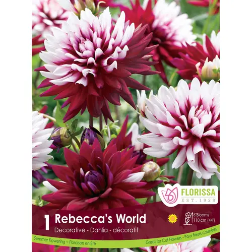 Red and white decorative dahlia. 1/pkg. Plant in a full sun location with well draining soil when ground temperatures warm, usually early June in Nova Scotia once risk of frost has passed. Lift tubers and store in vermiculite late fall after the first hard frost.