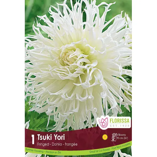 White fringed dahlia. 1/pkg. Plant in a full sun location with well draining soil when ground temperatures warm, usually early June in Nova Scotia once risk of frost has passed. Lift tubers and store in vermiculite late fall after the first hard frost.