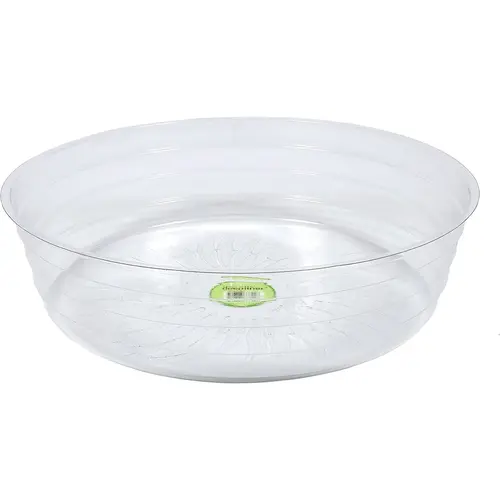 A deep clear, plastic saucer with a decorative fern pattern. An economical and lightweight way to retain water and protect surfaces. For indoor and outdoor use.