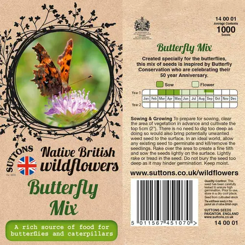 Our Native British Wildflowers range has been developed from research conducted by Butterfly Conservation, BBKA, RSPB and the Woodland Trust. This butterfly mix contains over 30 native species of wildflower and includes many nectar-rich species. Attracts butterflies amp; other beneficial insects to the garden, it also includes caterpillar food plants. Suited to planting in domestic flower beds, containers and large pots, area coverage is 1-2 square metres depending on how thickly sown. Flowers late May-early September.