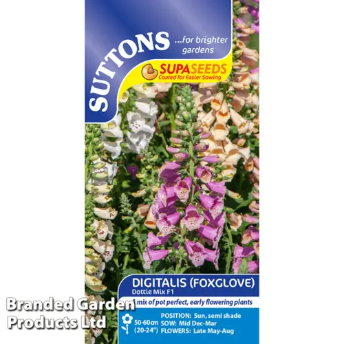 This compact variety is extremely fast to flower, producing blooms in its first year (just 20-24 weeks after sowing), unlike other varieties which don't flower until the second year. Foxglove 'Dottie Mix' has tidy foliage with tall flower spikes bearing large blooms that are swiftly followed by secondary spikes to create a striking display. The flowers offer a wonderful colour palette of five complimentary colours, all with speckled throats and also includes the unique and much-loved variety 'Dottie Warm Rose'. Digitalis 'Dottie Mix' is much more compact than other varieties and the pelleted seeds make them much easier to sow. Ideal for small sunny borders and patio pots as well as making an excellent addition to cottage gardens. Maximum height: 60cm (24in). Spread: 35cm (14in).