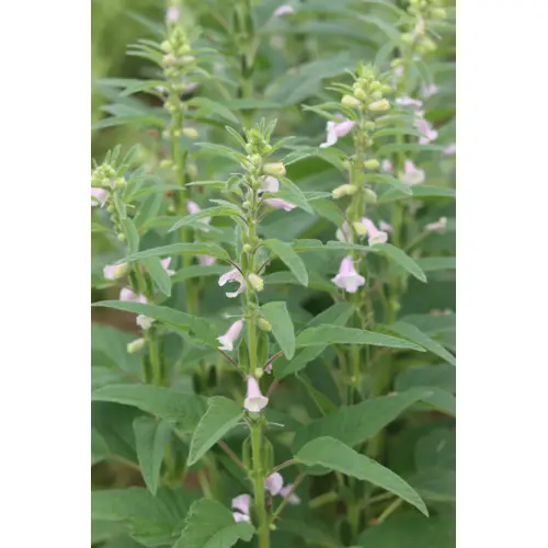 Tall plants with velvety leaves and tubular soft-pink flowers. Each flower develops into a single pod, which when mature and dry are filled with golden-yellow sesame seeds. Sesame needs similar growing conditions as tomatoes, with maximum heat and sun. We grew ours in the tunnel in order to extend their growing season, but they'll also mature outdoors in much of Nova Scotia. If the pods are fully formed but not yet dry when the first fall frost approaches, the whole plant can be cut and hung indoors to continue ripening. 40+ seeds