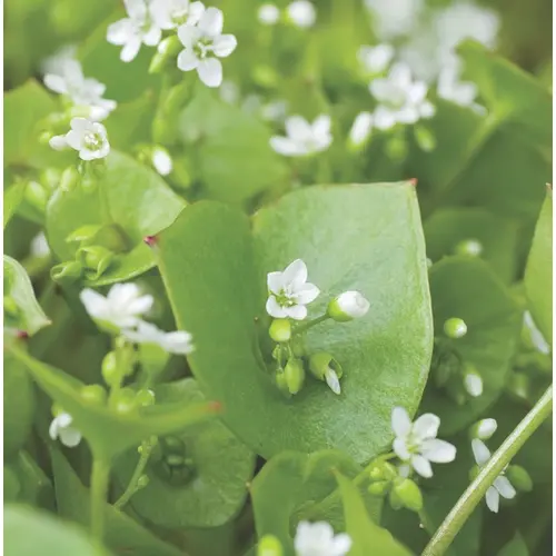 Heart-shaped leaf pair wrap around a white-flowered stem. Hardiest of winter salad greens, can tolerate moderate frost and can be grown all winter long in cold frames. Leaves have a wild, fresh flavour.