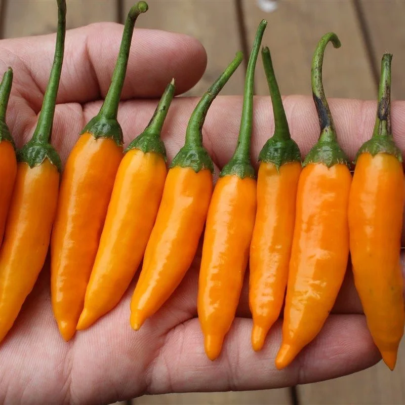 This superb hot pepper is C. baccatum, as opposed to most other peppers which are C. annuum. A bit less spicy than cayenne with a touch a citrus-like sweetness, tasty fresh and dries very easily. Beautifully golden orange 3 inch long peppers with thin skin. Prolific early producers, Criolla Sella is native to Bolivia and adapted to cooler temperate climates.