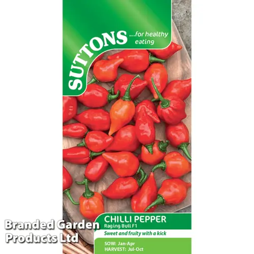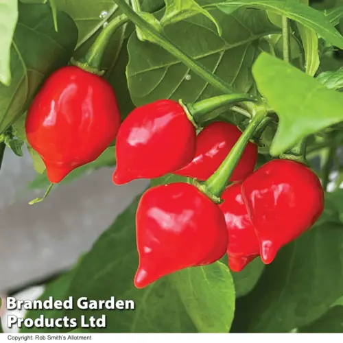 This high yielding chilli produces an abundance of teardrop-like, vibrant red fruits. Chilli 'Raging Bull' is a cross between the super-hot Habanero and the mild and sweet Biquinho giving it the SHU rating of 100,000. Height and spread: 60cm (24in).