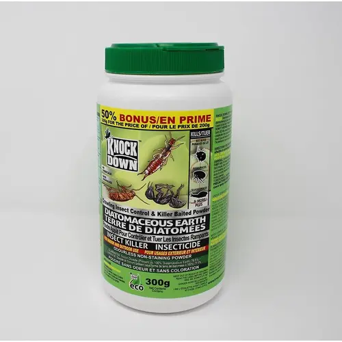 Active: Guarantee: silicon dioxide (present as 100% diatomaceous earth) 79.5% Powder For Indoor and Outdoor Use. Home and Garden Insect Control. All purpose insecticide – formulated using FOOD GRADE natural fresh water Diatomaceous Earth (DE) along with two food grade baits. Eliminates: Ants, Crickets, Silverfish, Fleas, Earwigs, Caterpillars, Slugs, Sowbugs, Cockroaches, Potato beetles, Centipedes, Millipedes and Bed bugs