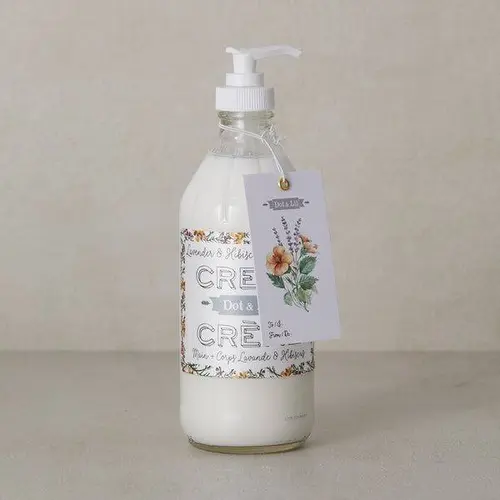 One of the most often requested additions to the Dot & Lil line, we are proud to finally launch our first ever cream! Our hand + body crèmes are made with a rich and emollient shea butter and coconut oil formula that deeply moisturizes and protects skin. An elegant glass bottle that matches our liquid soaps and milk baths. Comes with a beautiful gift tag with floral illustration. Our essential oil Lavender scent is fresh and herbal, straight from a garden flower bed! A very soothing and relaxing scent.