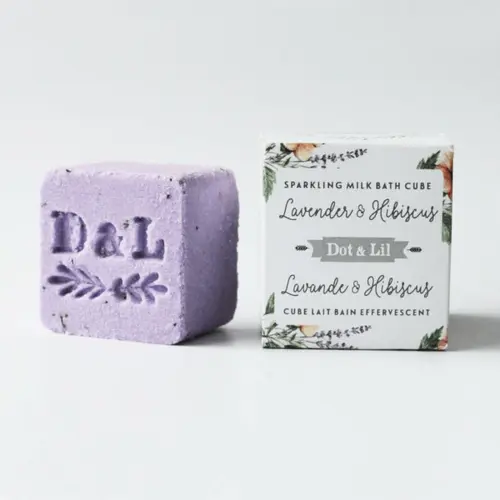 We know you’ve been waiting for our version of a bath bomb for years. They are finally here! Add cube to bath water and watch it fizz, dispersing a rich moisturizing blend of milk and real flower petals. Individual cubes come in a pretty box. Our famous Dot & Lil milk bath, now as a sparkling bath cube! Our essential oil Lavender scent is fresh and herbal, straight from a garden flower bed! A very soothing and relaxing scent.