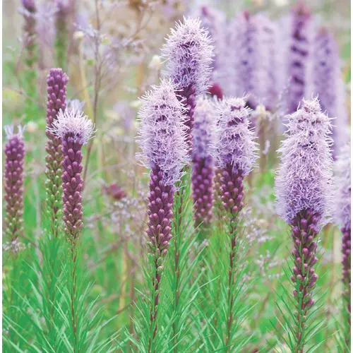 Liatris is a long-lasting perennial with intriguing fluffy flower spikes in a lovely shade of soft purple. This mid-summer bloomer bears its flowers from July through September. Note: this is not Purple Loosestrife. Rosy-purple flower spikes grow 50cm (20") tall and make excellent cut flowers.