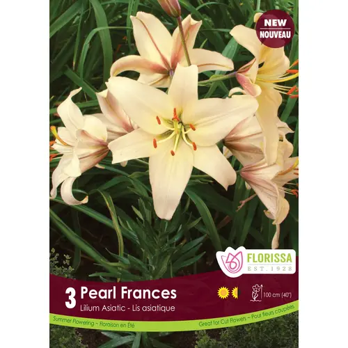 Cream coloured Asiatic lily. Grows up to 40" (100cm) tall and 12" (30cm) wide. Hardy to zone 2. 3 bulbs per package.