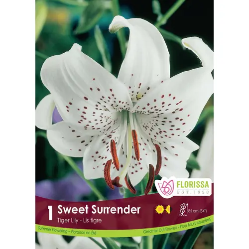 White tiger lily. Unique blooms with dark speckles, mid to late summer blooming. Hardy to zone 3, 1 bulb per package.