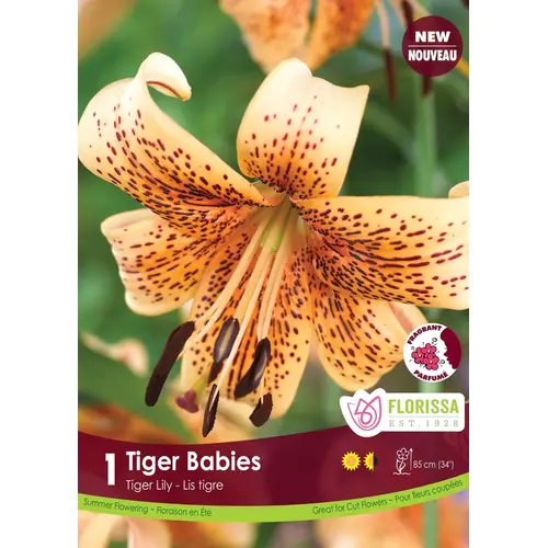 White tiger lily. Unique blooms with dark speckles, mid to late summer blooming. Hardy to zone 3.