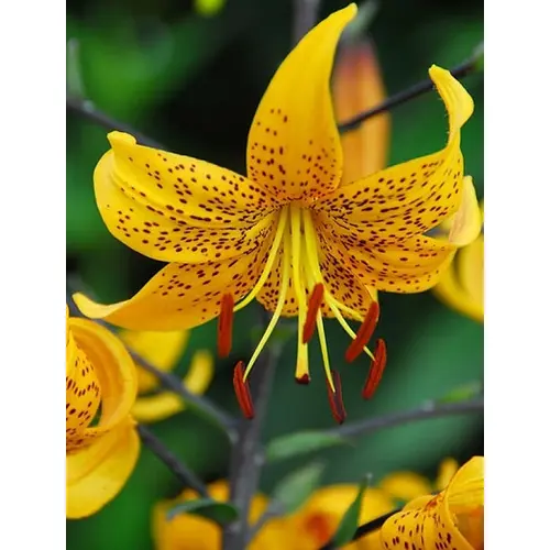 A yellow tiger lily (Lily leichtlinii), with reflexed blooms and black speckles. Mid-to-late summer blooming, hardy to zone 3. Height: 85cm (34"). 1 bulb per package.