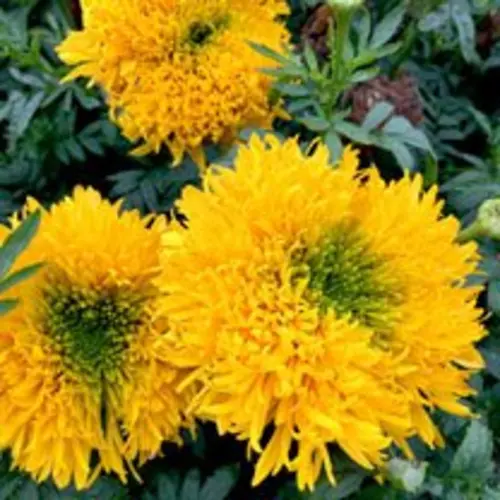 Much bigger than other marigolds, this variety flowers 3” across, giving it a bushy appearance. Unlike other marigold varieties, these stunning blooms are resistant to poor weather too. The rock-hard acid green eye is so tightly compacted that the water sits on the top rather than soaking into the flower and rotting it. Bright lemon yellow chrysanthemum-like flowers with stunning large 3" double blooms. Flowers start with a bright green eye and then 'puff' out into a full flower. Great for the back of a border or indoors as a cut flower - best with staking.