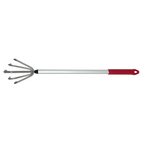 5 tines cultivator with a short aluminum handle. Perfect for working in flowerbeds or raised beds.