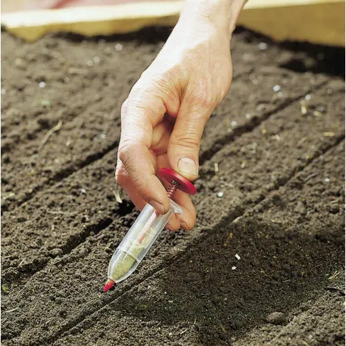 Small seeds are planted exactly where wanted with this small plunger-type dispenser.