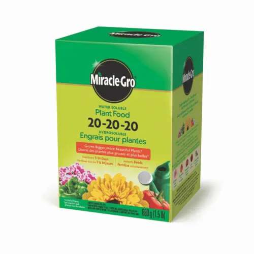 A little plant food goes a long way toward bigger, more beautiful plants – at least when the plant food is Miracle-Gro Water Soluble Plant Food 20-20-20. It instantly feeds flowers, vegetables, houseplants, roses, trees, and shrubs. This all-purpose plant food features double-feeding action, so plants get the nutrients they need through both their leaves and their roots. Helps plants grow fast and large.
