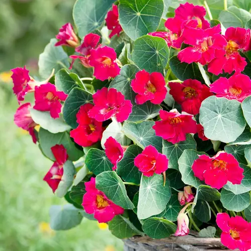 A first in nasturtiums, a small mounding plant, perfect for containers. Deep rose coloured flowers are almost the same size as the small, dark green leaves; making the flower truly impressive with flower power! The improved flower habit means less flower flopping, so the blooms stay more visible than most other varieties. Winner of both a Fleuroselect and AAS award. Flowers from summer to the first frosts.