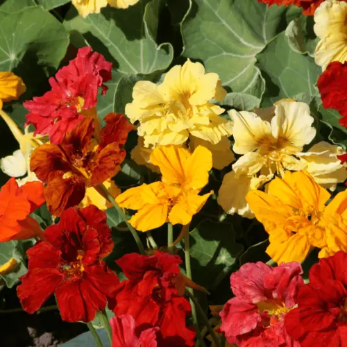 Large, lush double blooms elevate the simple nasturtium to an eye-catching garden beauty! From ivory to mustard yellow to deep red streaked with gold, these nasturtiums bring vibrant colour to your vegetable and flower beds. Its trailing habit makes it a great selection for baskets and containers too!