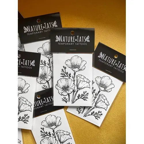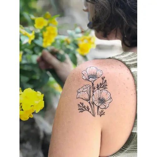 - Golden Poppy: Golden poppy flower, otherwise known as the California Poppy. Hand-drawn, black and white ink temporary tattoo.