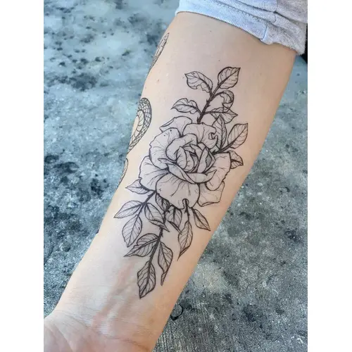 - Rose Blossom: Hand-drawn rose blossom temporary tattoo design. This elegant design was inspired by my delicate and plump pink roses with round petals, freshly clipped from the garden with several leaves and stems attached.