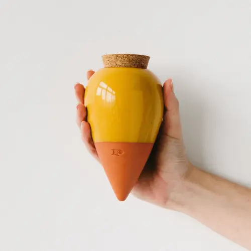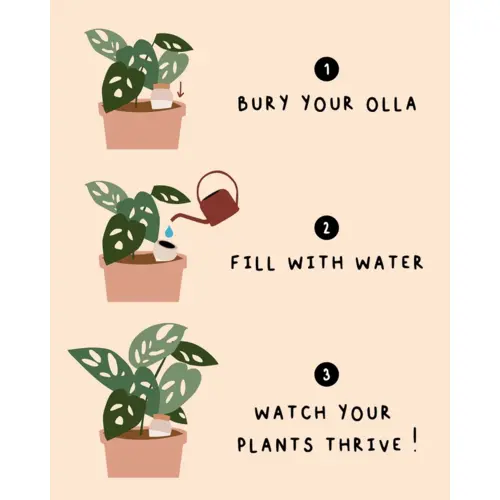 Ollas (or Oyas) are a traditional, easy way to save water and grow better plants. Simply bury your olla in the soil, fill it with water, and watch your plants thrive! Moisture will seep through the porous terracotta walls to water your plants at their roots. Every olla is individually packed with an illustration card.