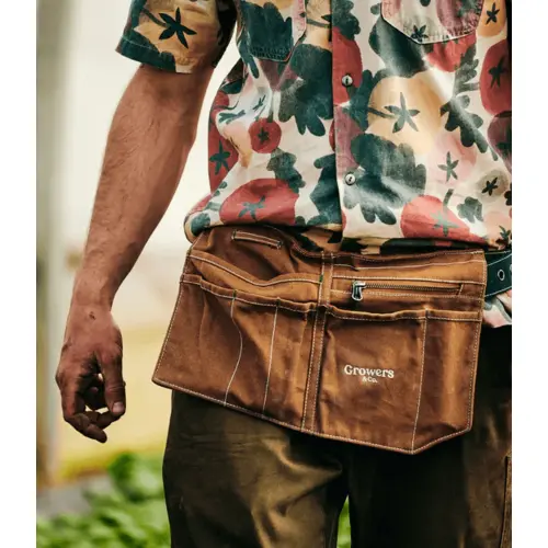Made from 12oz waxed canvas that resists water and dirt, the Field Belt has your back during long planting or harvesting days. With an adjustable belt and plenty of roomy pockets for storage, this accessory can easily stash your water canister, phone, pencils, small tools, and even includes a loop for a hand towel, keeping everything you need within arms reach.