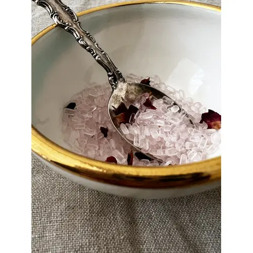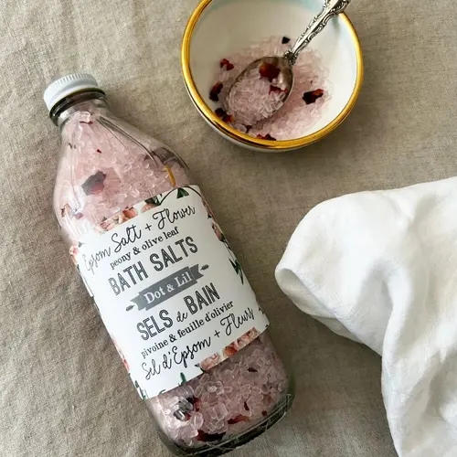 Bath salts are a blend of epsom salt, real botanicals & flower petals. Very good for muscle pain and relaxation. Packaged in a large glass vintage-style bottle.