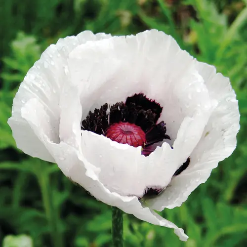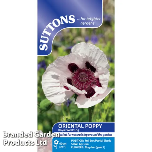 Poppy 'Royal Wedding' bears large, dazzling white flowers with a contrasting dark centre that will attract plenty of butterflies and bees. For maximum impact, plant this easy-to-grow Oriental Poppy in clumps in a sunny border. These robust, clump-forming plants will flower at the beginning of summer and once flowering has finished, their striking seed heads will provide a second season of interest. Height: 60cm (24"). Spread: 50cm (20").
