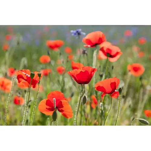 Papery red blooms create splashes of colour among fields and meadow grasses. This hardy annual is easy to grow and brings a romantic charm to the garden. Leave the faded flower heads to set seed and enjoy drifts of poppies the following year. Perfect for sprinkling among wispy grasses or threading through gravel gardens and rockeries. Height: 60cm (24"). Spread: 30cm (12").