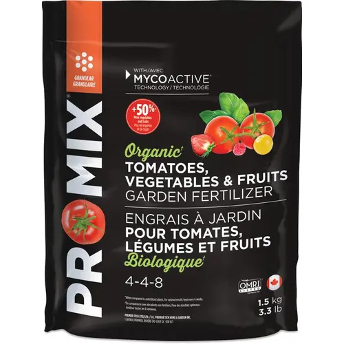 This PRO-MIX organic garden fertilizer for tomatoes, vegetables & fruits 4-4-8 is designed to improve soil nutrition and optimize conditions for healthier plants. Recommended for organic production of tomatoes, vegetables and fruits.