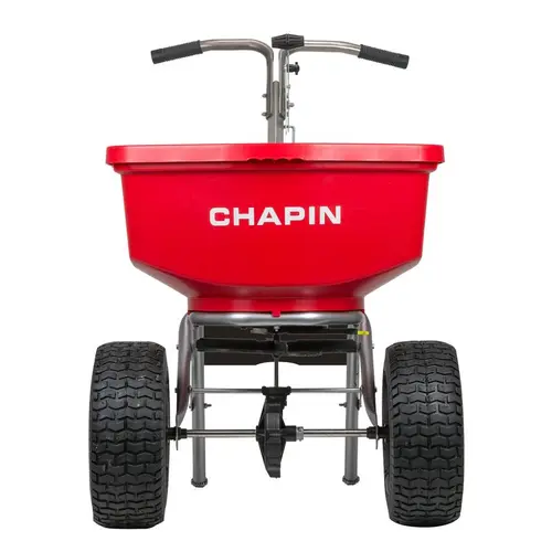Chapin Professional Spreaders were built to provide all of the features and functionality needed for reliable, efficient performance. The 100-Pound Professional Spreader has a large, 1-piece heavy-duty hopper fully supported by a rugged stainless steel frame. The stainless steel T-handle features comfort grips. The adjustable rotary gate accommodates a variety of material, and a cast zinc-plated agitator helps prevent clumping. Chapin Professional Turf Spreaders feature directional spread pattern control to ensure material is applied where it is needed. Enclosed metal gears with a grease fitting prevent debris interference. This heavy duty turf spreader is equipped with wide tread 14-inch pneumatic tires for professional use. A rain cover and hopper grate are included.