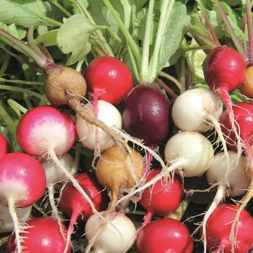 A blend of colours with different tastes. Easy to grow and colourful in salads. Harvest April-October.