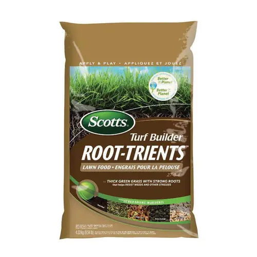 If you relish the thought of thick, green grass as much as you love the planet, look to Scotts Turf Builder Lawn Food with Root-Trients. Using our patented All-in-one technology, it promotes strong roots and a more durable lawn by delivering a perfect combination of Turf Builder lawn food and rich, organic ingredients, including alfalfa meal, bone meal, kelp, worm castings and rice hulls. Plus, the packaging is eco-friendly so you can enjoy greener living in every sense!