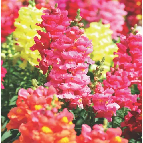 Snapdragons are an all-time favorite bedding plant for adding lasting, season-long colour to flower beds, borders and containers. The large flower spikes can be cut for long-lived fresh flower arrangements. Majestic Mix is a mix of pink, red, yellow and white blooms growing 60-75cm (24-30") tall.
