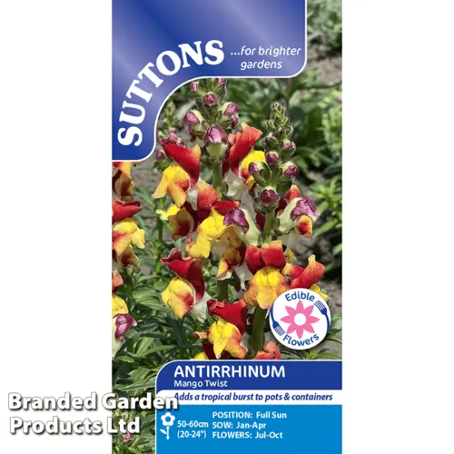 This exciting Antirrhinum will be sure to add a tropical touch to any garden! 'Mango Twist' is an award winning variety that bears striking flowers with vibrant scarlet upper petals, lemon yellow lower petals and a white throat. This Snapdragon is perfect for sunny borders and its long stems with multiple side branches look superb in a vase display indoors. Height: 60cm (24in). Spread: 40cm (16in).