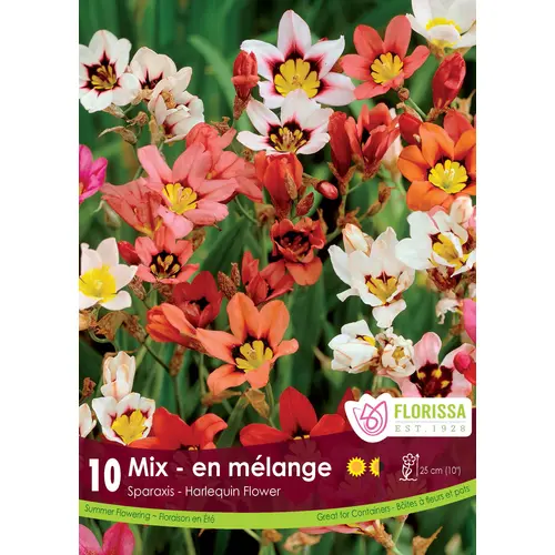 Frequently called by their more common name, Harlequin Flower, Sparaxis are easily one of our favourite additions to a summer garden. As they are hardy to Zone 8, we recommend lifting them when temperatures turn cool and the greenery dies back aso they might be enjoyed year after year. Established plants are about 10" tall. 10 per package. All summer flowering bulb products, including bulbs, corms, and rhizomes, are final sale. No returns or exchanges.