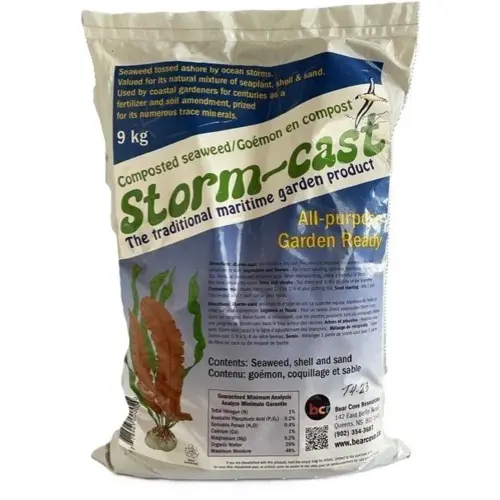 Storm-Cast is a soil amendment produced through the controlled breakdown of stranded seaweeds and companion organisms mixed with shell and sand from wave action (called wrack). Composted seaweed is useful throughout the growing season and is excellent for all applications, including top-dressing. Made in Nova Scotia.