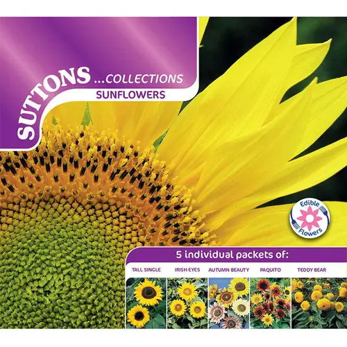 Fill your garden with sunshine with our collection of five stunning varieties: Tall Single - Very tall with enormous golden-yellow flowers. Height 2.1-2.4m (7-8'); Irish Eyes Dwarf - With attractive yellow-green flowers. Height 45cm (18"); Autumn Beauty - A beautiful colour mix, from pale to bright yellows and red bicoloured blooms. Height 1.8-3m (6-10'); Paquito Mix - Dwarf, bushy Sunflowers in a range of colours from pale yellow to deep bronze. Height 45-50cm (18-20"); Teddy Bear - A dwarf variety with 'fluffy' double yellow flowers. Height 40-60cm (16-24"). Easy to grow. A real favourite with children. Flowers like very large daisies with brightly coloured petals.