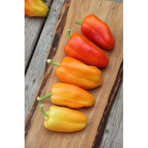New variety developed in Nova Scotia by our friends at Yonder Hill Farm! Early to bear and immensely productive. Sweet and fruity, they're delicious simply sliced raw, or roasted and preserved. Blocky bells start out yellow and ripen to orangey-rose. Discovered and selected at Yonder Hill Farm from a chance cross between Klari Baby Cheese and Napoleon in 2018. Not yet 100% true-to-type, but close enough to offer them. 25 seeds